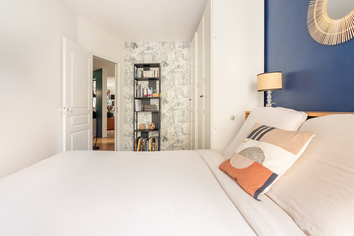 Tilfluktssted i toppetasjen med en stor, solbelyst balkong og uhindret utsikt over Eiffeltårnet. Den er nyoppusset av en designer, og har en italiensk dusj, en komfortabel queensize-seng og en sovesofa av høy kvalitet for grupper på 3-4 personer. Lys stue/spiseplass, raskt bredbånd og Netflix. Sikker bygning i et pulserende nabolag fullpakket med kafeer, restauranter og butikker. T-banestasjonen ligger bare to minutters gange unna. Perfekt for par, venner eller jobbopphold.