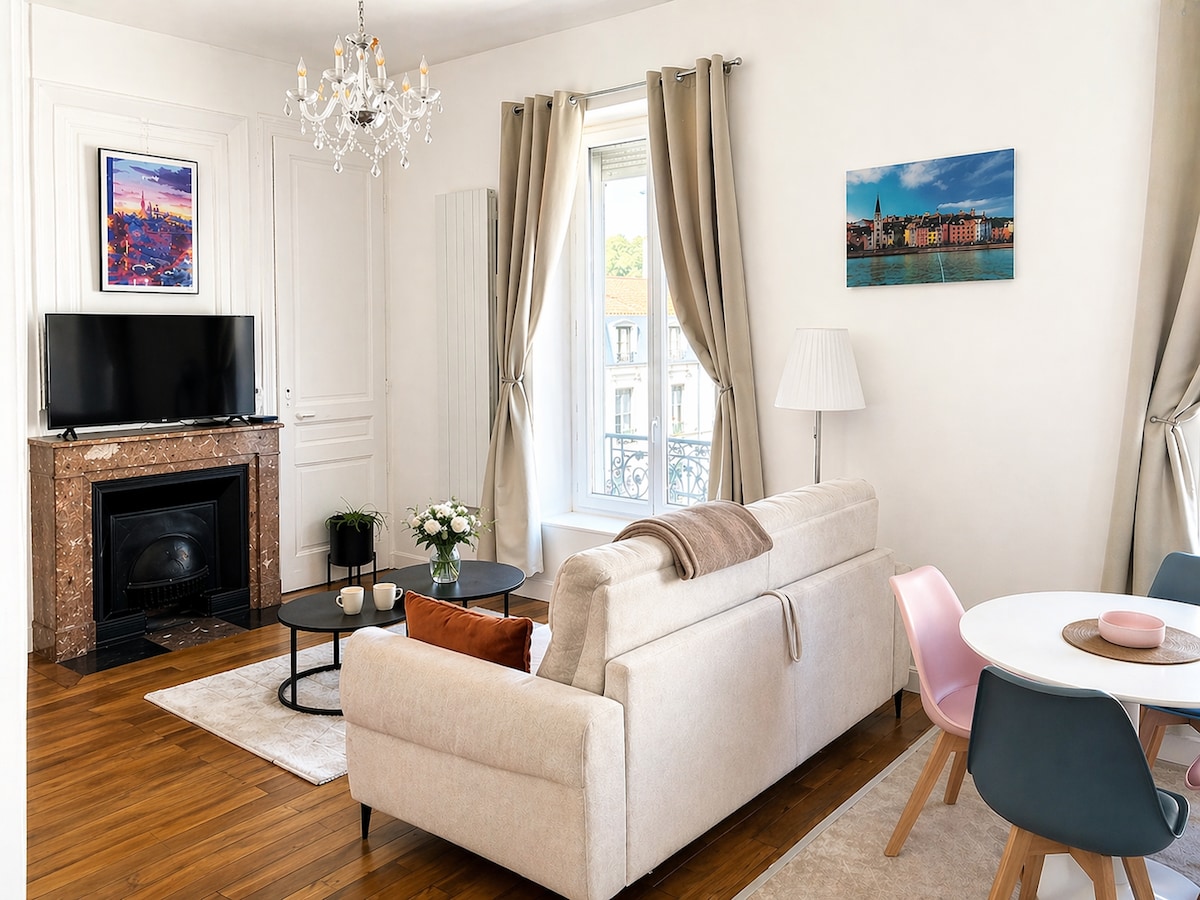Prestige leilighet i fransk stil, 90 kvm, i øverste etasje med heis, for opptil åtte personer, med balkong. Romslig, rolig, lys og stilig, den typiske Lyon-stilen med tregulv, høyt tak og peiser, kombinert med moderniteten til et åpent oppholdssted, det nyeste utstyret og en trendy dekorasjon, gjør dette stedet utrolig vennlig og imøtekommende. I hjertet av Lyon, rett ved siden av alle offentlige transportmidler og fasiliteter, 5 minutter fra stedet Bellecour og fra gamlebyen!