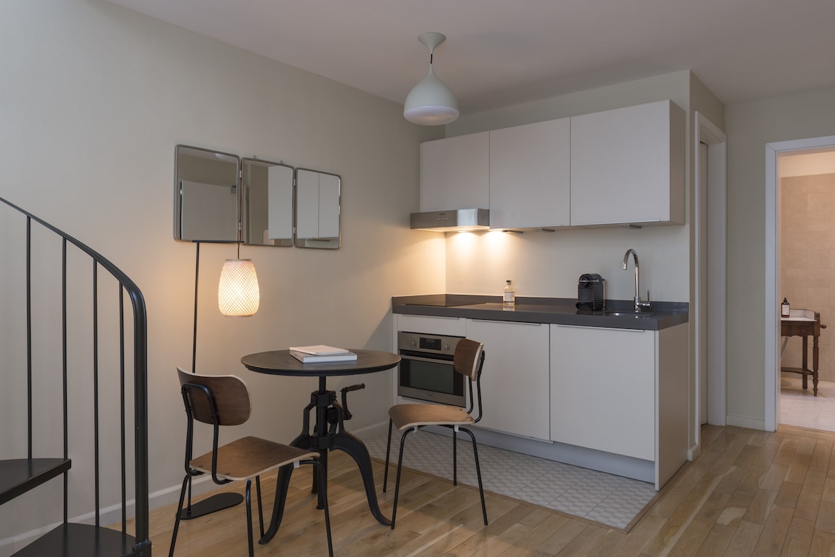 Beliggende i hjertet av South Pigalle, mellom Montmartre, Moulin Rouge og de store varehus, kan du nyte en elegant og sentral bolig. Loftsleiligheten vår er ideell for et turistopphold eller for å jobbe, og tilbyr all nødvendig komfort, med et kjøkken og spiseplass under et glass tak, og et eget kontorområde.