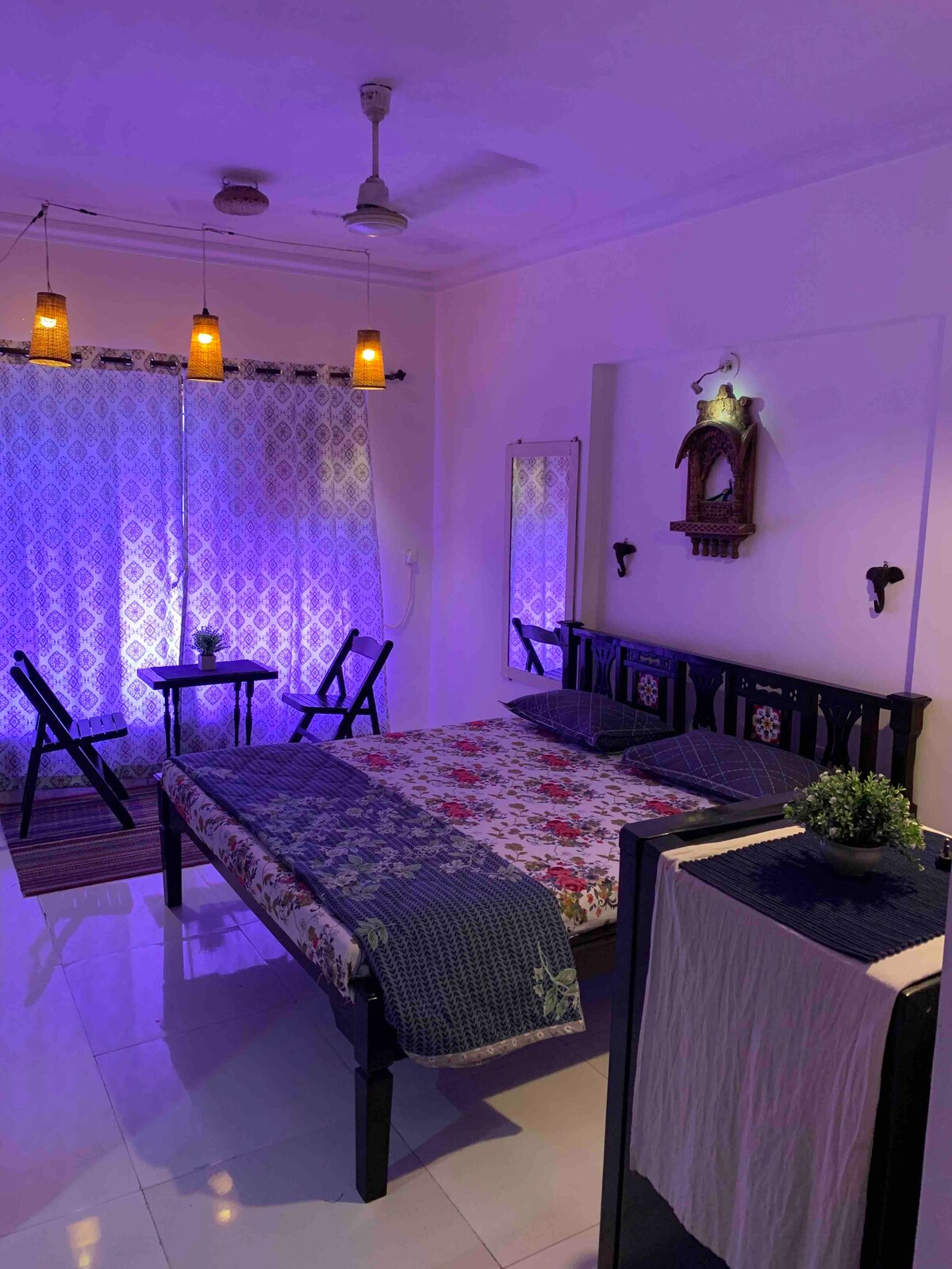 Leiligheten ligger i en boligbygning innenfor en grønn sone. Det tilbyr et fredelig og rolig miljø uten forstyrrelser. Soverommet har klimaanlegg og har ulike fasiliteter, som vist på bildene. Andre funksjoner inkluderer trådløst nettverk, smart-TV, et møblert kjøkken med LPG-gass og varmt og kaldt vann. Leiligheten er romslig og godt ventilert. Vær oppmerksom på at ID-bevis er obligatorisk, og besøkende er ikke tillatt. Innkvartering er kun tilgjengelig for indiske borgere; ingen utlendinger er tillatt.