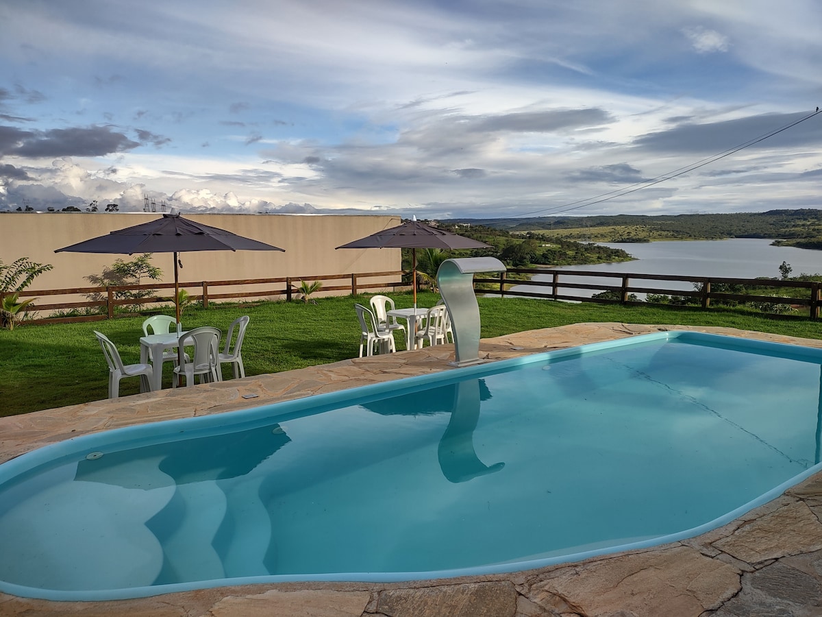 Leies ut pittoresk gårdshus, med unik design, plass til 10 personer. Plassert på toppen, med fantastisk utsikt og tilgang til innsjøen Corumbá IV. Består av 3 soverom, suite, toalett, 2 bad, stor stue og kjøkken. Omgitt av innbydende balkonger, for å nyte vakre dager på landet.