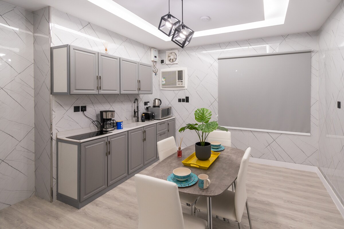 Velkommen til den nydelige leiligheten vår med ett soverom og stue i Jeddah! Slapp av på dette nyinnredede og sentralt beliggende stedet som tilbyr enkel tilgang til de viktigste attraksjonene i Jeddah, i nærheten av: – Alhabib sykehus (syv minutter). – Andalus kjøpesenter (syv minutter). – Alsalam kjøpesenter (syv minutter). – King Abdulaziz-universitetet (5 min). – Haramain togstasjon (12 minutter). Enten du er her for forretninger eller fritid, vil den elegante enheten vår tilby deg et minneverdig opphold.