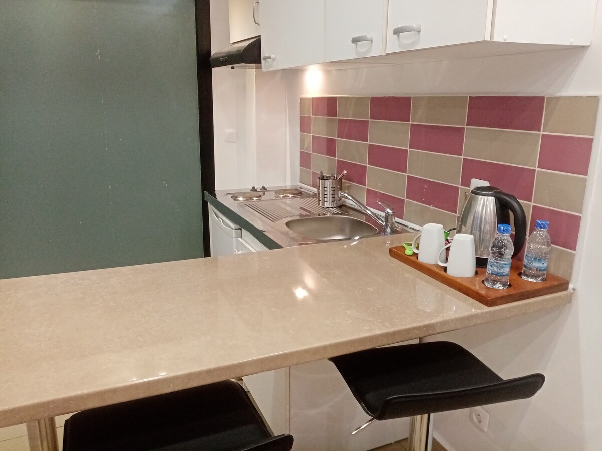 Studio og kjøkken med hage og bassengtjenester inkl.