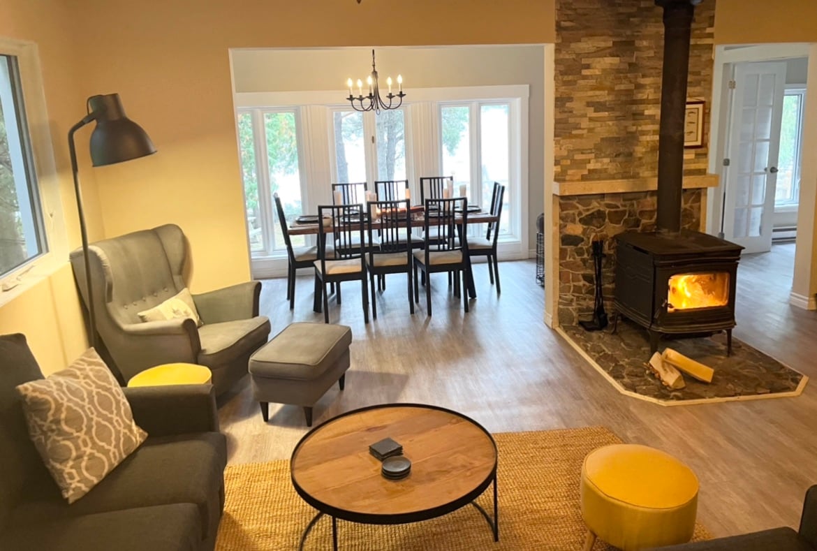 Unwind by a campfire on the quiet bay, relax in the gazebo, or soak up panoramic lake views from inside. This cozy cottage offers fast WiFi, Netflix, games, puzzles, and a record player. Enjoy year-round fun with great fishing, seasonal gear, and direct access to 2,000 km of snowmobile trails. Pet-friendly and full of charm—perfect for both adventure and relaxation. Check us out on insta @CozyBohoLakeHouse CITQ Establishment 303126