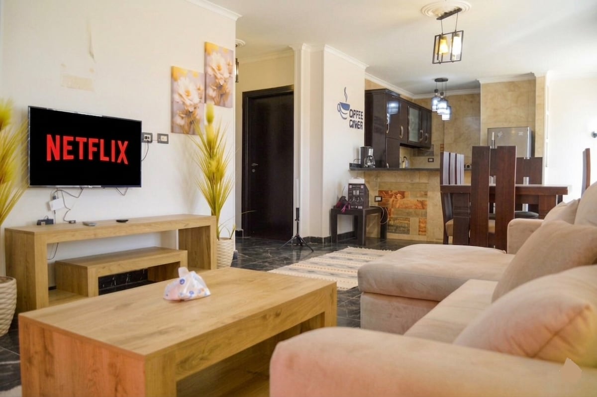 ★ Velkommen til vårt gjestefavorittferiested i hjertet av Sheraton Heliopolis! ★ Denne plettfrie, totalrenoverte leiligheten med tre soverom er ideell for familier eller jobbreisende. Bare ti minutter fra CAI lufthavn, og den har fullt kjøkken, en stilig stue med satellitt-TV og 1,5 bad for komfort. Gå til livlige butikker og spisesteder, eller få enkel tilgang til store motorveier. Din rolige og praktiske base i Kairo venter.