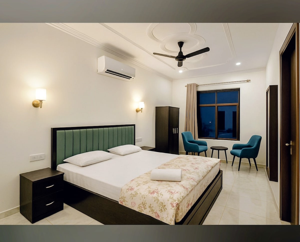 Velkommen til Kalindi Villa by Soul Banaras – en nybygd, fredelig 3BHK i første etasje med alle moderne fasiliteter. Den har eget bad, balkonger, et pulverrom og et fullt kjøkken – perfekt for familier og små grupper. Separat inngang sikrer fullstendig privatliv. Vertene bor i første etasje uten forstyrrelser. Praktisk plassert i nærheten av motorveien med enkel tilgang til flyplassen og nærme byen. Administrator Preeti er tilgjengelig kl. 09.00–19.00 og på vakt.
