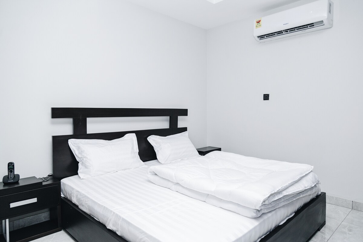 Moderne komfort i en stilig, vakkert opplyst leilighet med ren, moderne finish og en varm kveldsglød som umiddelbart føles eksklusiv og innbydende. Beliggende i et rolig nabolag 19 minutter fra flyplassen, 17 minutter fra Accra Mall, 10 minutter fra Atlantic Mall og ca. 30 minutter fra Aburi-fjellene, med enkel tilgang til butikker, forretningsknutepunkter og fritidssentre. Du er aldri langt unna alt du trenger, men likevel skjermet nok til å slappe av og koble av. Et elegant sted du kommer til å elske å komme hjem til.