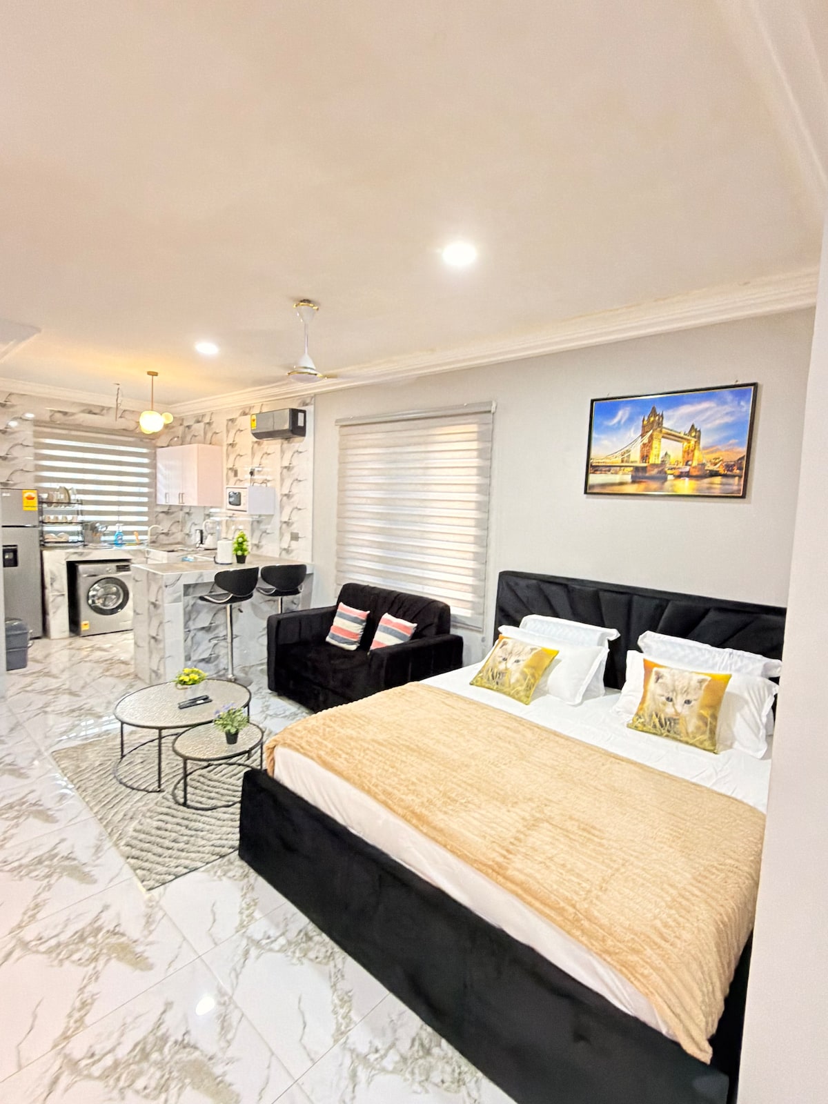 Opplev moderne studioleilighet i Premium Apartments med takbasseng og fullt utstyrt treningssenter, designet for komfort, velvære og avslapning i East Legon Hills. • Basseng på takterrassen • treningsstudio for daglig trening • pålitelig backupgenerator (strøm døgnet rundt) sikkerhet døgnet rundt • Henting på flyplassen er tilgjengelig. • Sikre og rolige omgivelser • Moderne, fullt møblerte leiligheter. Perfekt for • Par og hjemmeferier • besøkende fra diaspora • Helsebevisste reisende • Små grupper (opptil 16 gjester fordelt på 7 enheter).
