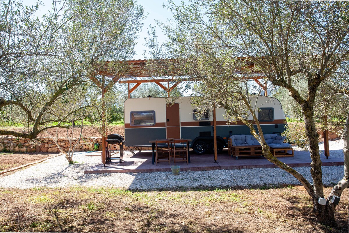 Luksuriøs campingvogn i en olivenlund