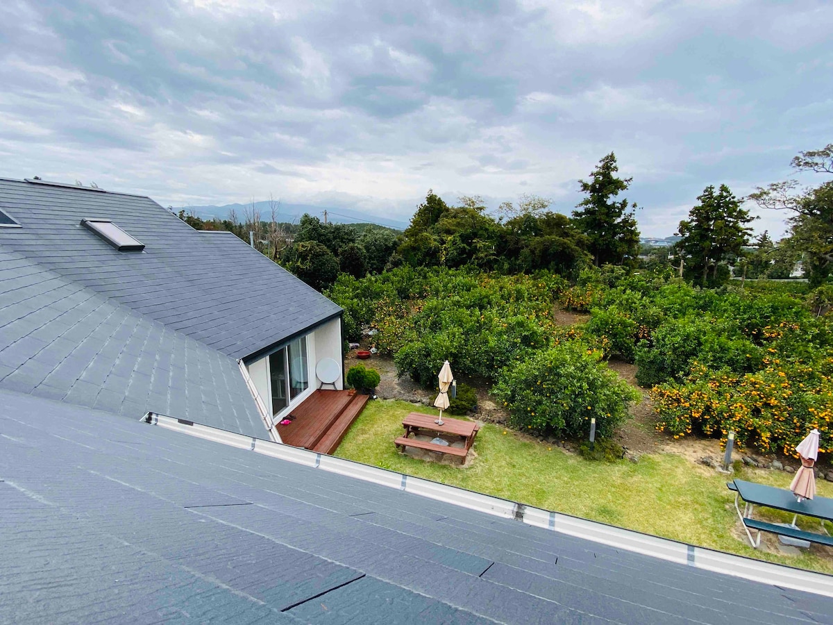 Hei, dette er Stay Dotori. Dette er et Jeju-type rekkehus omgitt av klementinmarker, registrert som en bedrift i en jordbrukslandsby. Du bruker den andre etasjen alene Du kan bruke den separate inngangen for gjester. Det er en parkeringsplass for gjester rett utenfor. Vår 'Stay Dotori' er ferdigstilt med naturlig skjønnhet slik at du kan føle kafésensasjonen. Det ligger i et fjellområde 25-30 minutter fra flyplassen, Det er en plassering hvor du kan se mandarinfeltet og havutsikten fra hvor som helst. Det er plass til opptil 3 personer i en 2-personers innkvartering. 30 000 KRW vil bli belastet for hver ekstra person. (Småbarn under 24 måneder er også inkludert i antall gjester.) Hvis du ønsker ekstra sengetøy etter reservasjon for to personer, vil du bli belastet 20 000 KRW. Håndklær tilbys to per person (én natt), og vi vil gi deg flere hvis du ber om det. Sørg for å overholde innsjekkings- og utsjekkingstidene for neste gjest. Innsjekkingstid er kl. 16.00, utsjekkingstid er kl. 11.00. ### Instagram @stay_dotori
