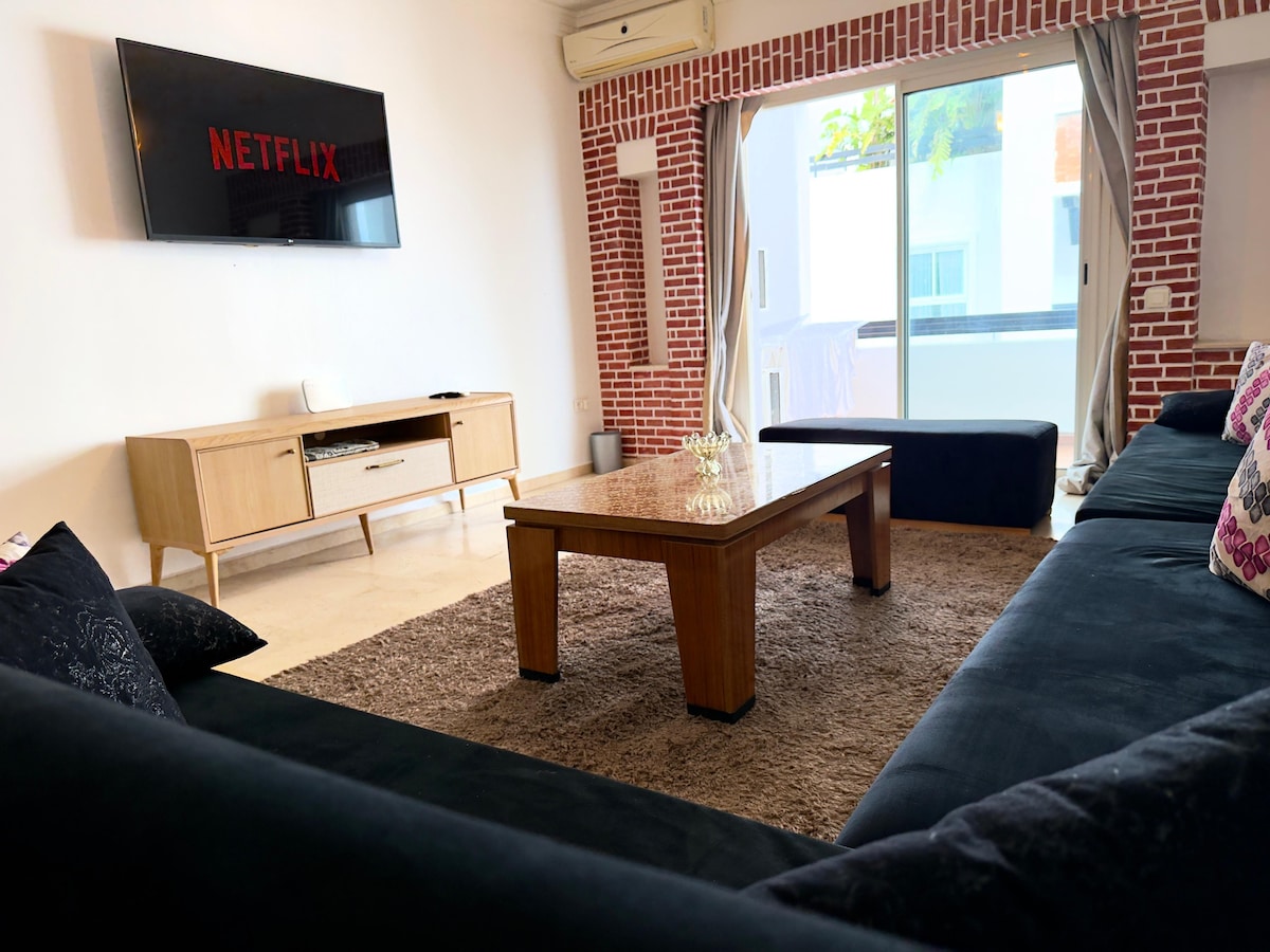 Solrik leilighet i første etasje i sentrale Agadir, noen skritt fra kaféer, butikker og ti minutters gange til stranden. Nyt et koselig stueområde med en 65 tommers TV, raskt trådløst nettverk og et fullt utstyrt kjøkken. Vi hjelper deg med å planlegge uforglemmelige opplevelser: kamelridning, Agadir Sahara solnedgang og sandboarding, Paradise Valley-turer, surfing, skøyter, firehjuling, jetski, fiske med mer. Flyplasstransport er tilgjengelig. ⚠️ Kun registrerte gjester er tillatt, ingen besøkende utenfra.