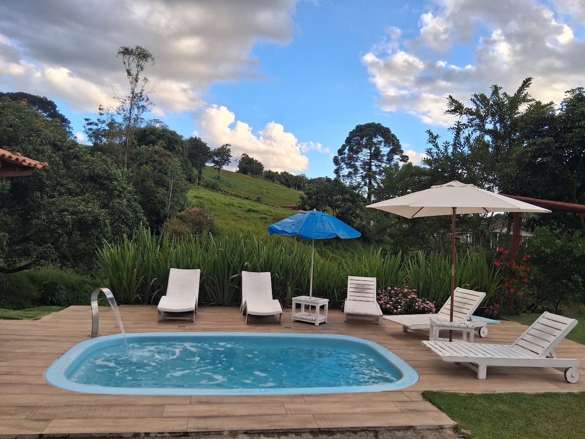 Kom og bo i det mest sjarmerende huset i Serra Negra🏠, med et svømmebasseng med spa, en bålplass, hengekøyer i hagen, en pergola, en lekeplass for barna, et velutstyrt og romslig grillområde og en vakker hage for deg og familien din å hvile og ha det gøy i komfort, bare fem minutter fra sentrum. 🥰