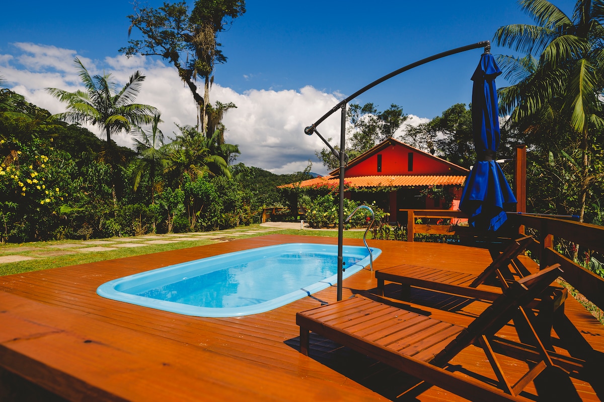 Tillat deg selv å leve denne opplevelsen, helt privat, ved siden av den frodige Atlanterhavsskogen med utsikt over elven og fjellet. Ta et skogbad uten å gi avkall på bekvemmeligheten av levering. Utforsk stiene og kjøl deg ned ved den vakre fossen. Huset har et utstyrt kjøkken, grill, bålplass og varmeovn (ved etter ønske), innendørs og utendørs dusjer med gassoppvarming og et luksuriøst SPA med hydromassasje. 400 tråders sengetøy og fasiliteter som vil overraske deg!