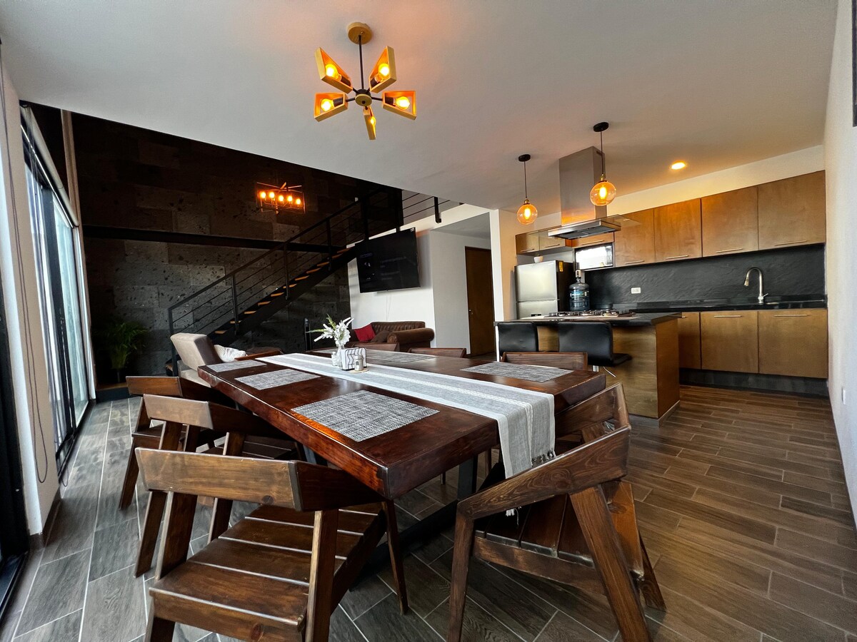 Moderne loftsleilighet med privat terrasse og utsikt over byen, kun noen få kvartaler fra Jardín de San Marcos. Plassert i en rolig, nybygd bygning, perfekt for å utforske Aguascalientes til fots. Kingsize-seng Ekstra sovesofa Privat terrasse med utsikt over byen Fullt utstyrt kjøkken. Vaskemaskin. Smart TV og trådløst nettverk Balkong Gangavstand til sentrum, i nærheten av området der San Marcos-markedet finner sted Vi har også flere leiligheter i samme bygning, ideelle for grupper som ønsker å bo i nærheten av hverandre.