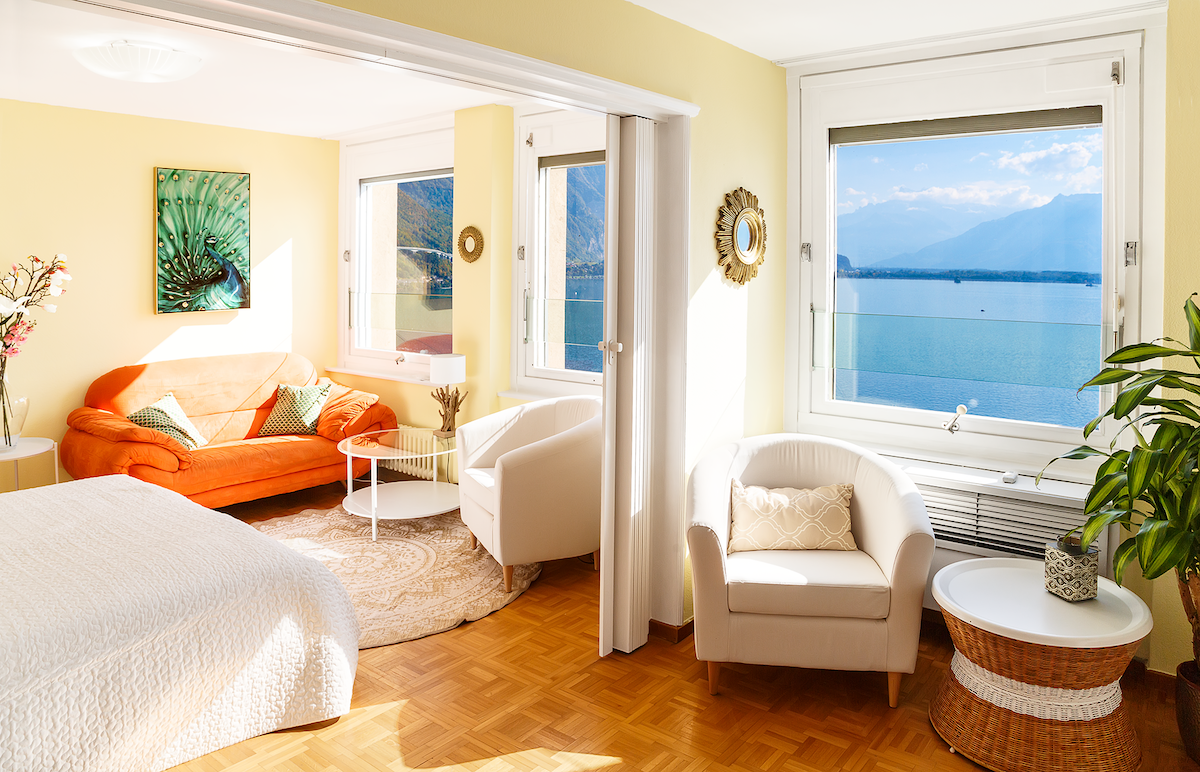 Dette studioet med praktfull innsjø og fjellutsikt ligger på frontlinjen av Geneve Lake, i 10 minutter fra sentrum av Montreux. I første etasje av bygningen finner du restauranten Le Contretemps. Det er 2 bordtennisbord i hagen og en tennisklubb i nærheten. Barna dine vil ha glede av en stor lekeplass foran bygningen. Vi kan skaffe deg racketer for badminton eller bordtennis på forespørsel. Ingen privat parkering. Ingen kjæledyr tillatt.