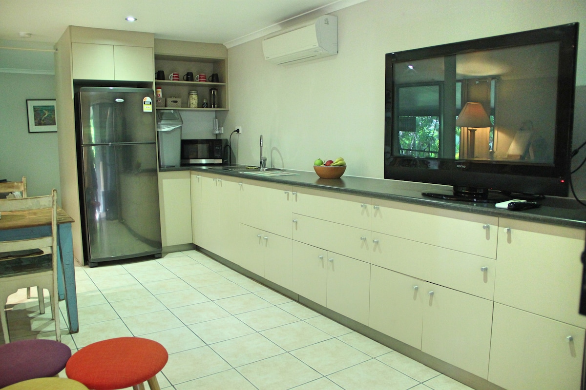 Sentralt plassert, vår kule, store og komfortable gjestesuite har separat, ekstern inngang fra huset vårt, trådløst nettverk, Netflix, bad, vaskeri og kjøkkenkrok som er privat. I Airlie Beach, uten å måtte gå opp bakker, er det en kort, flat spasertur til lagunen, strender, barer, kafeer, restauranter, butikker, Woolworths, buskspaserturer, havnen og den vakre strandpromenaden vår, som slynger seg til den pittoreske Coral Sea Marina, hvor du finner de beste restaurantene, flere barer med fantastisk utsikt over Whitsunday-øyene.