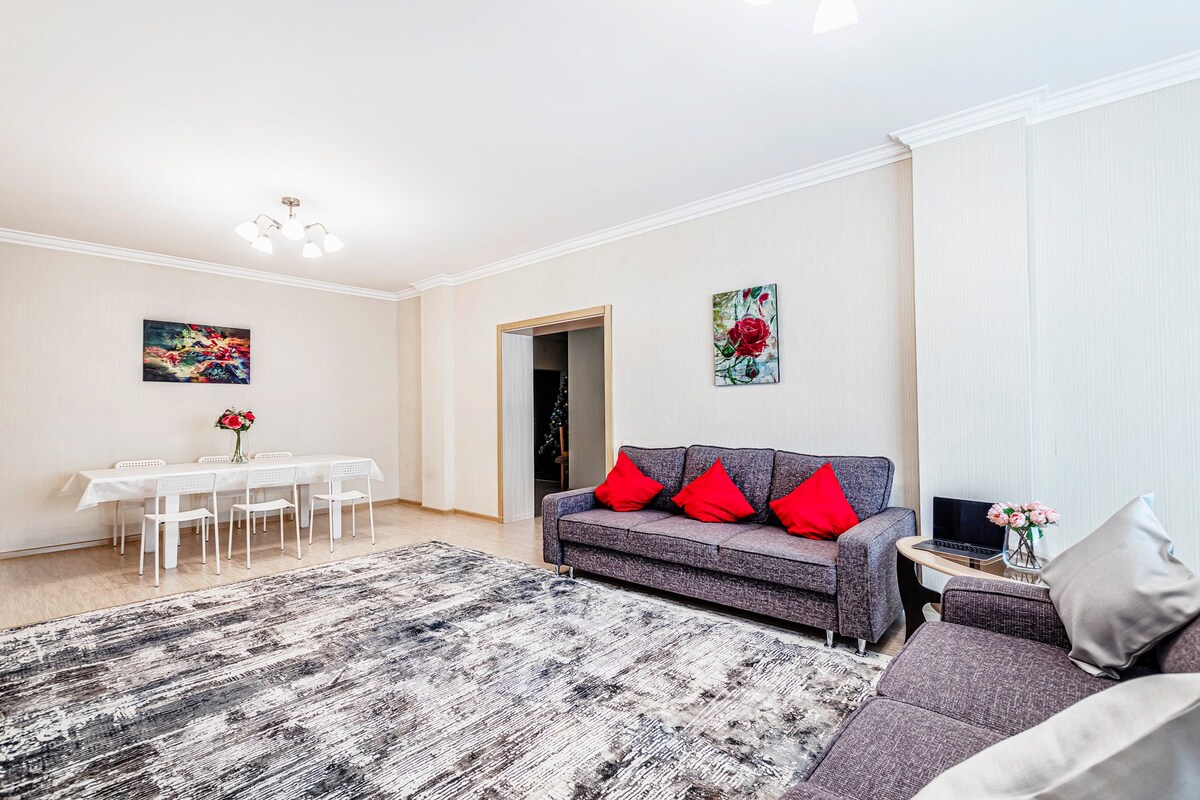 Det er alt for et komfortabelt opphold: Høyhastighets internett og smart-TV Utstyrt kjøkken; klimaanlegg; Rent sengetøy og håndkle sett 7 senger: to enkeltsenger med ortopediske madrasser + dobbeltseng+ sofa+sammenleggbar seng. Capital Center. Veldig utviklet infrastruktur, Expo-distriktet. Innenfor gangavstand er sportskompleksene Barys arena, etc., Botanisk hage, medisinske sentre (Cardiosurgery, etc.), kjøpesentre: Mega silkevei osv.