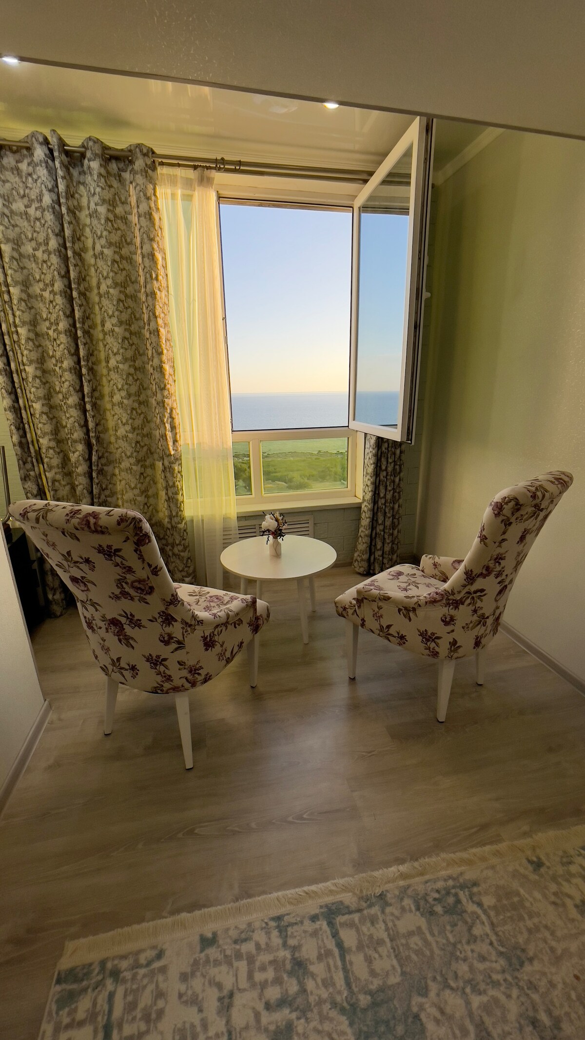 Vi presenterer en moderne leilighet for daglig utleie med en nyoppusset designeroppussing. Badet er laget i en minimalistisk stil med svarte aksenter: frittstående badekar, toalett og vask. Stuen og soverommet er innredet i varme farger med møbler laget av naturmaterialer, og panoramavinduene gir utsikt over sjøen. Kjøkkenet er utstyrt med moderne apparater og en koselig spiseplass. Interiøret suppleres med stilige lamper og aksentvegger som skaper komfort og kos.