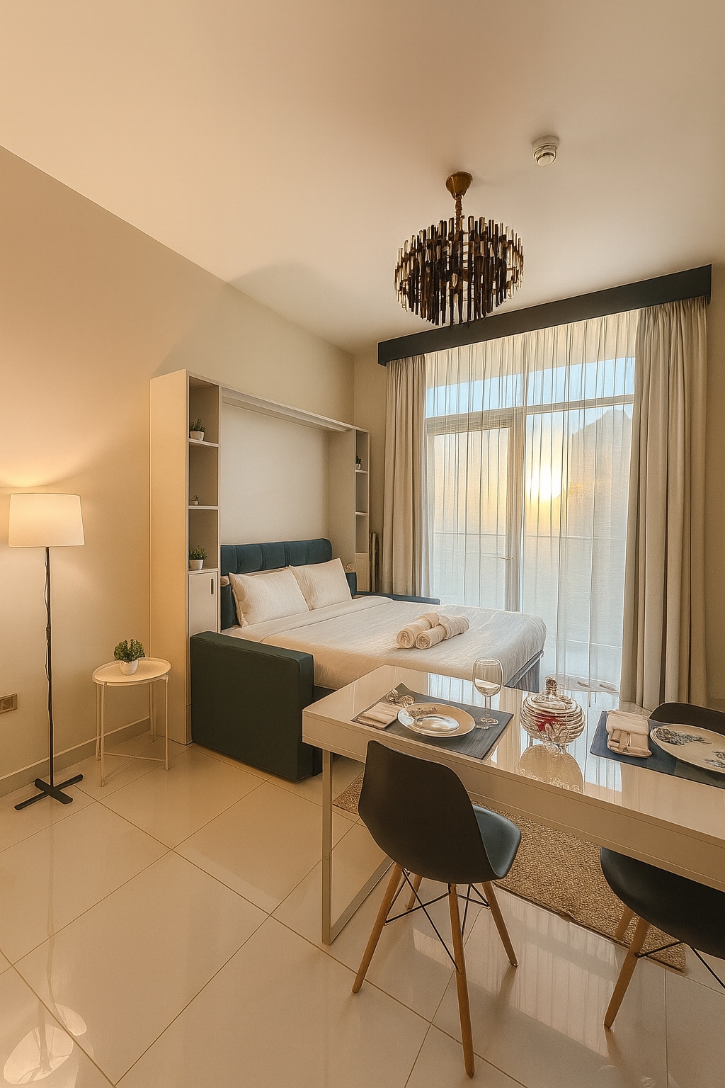 ✨ Stilig og moderne ettromsleilighet i JVC! Gå inn i et gjennomtenkt designet rom med moderne møbler og et snev av luksus🌟. Slapp av komfortabelt innendørs, eller utforsk de livlige omgivelsene i nærheten. 🏙️ Circle Mall ligger bare noen minutter unna, og tilbyr shopping, spisesteder og underholdning 🛍️🍴. Gjestene har tilgang til de beste fasilitetene, inkludert basseng og treningssenter🏊♂️💪. Perfekt for par, alenereisende eller forretningsreisende som ønsker komfort og bekvemmelighet i Dubai. 🌴✨