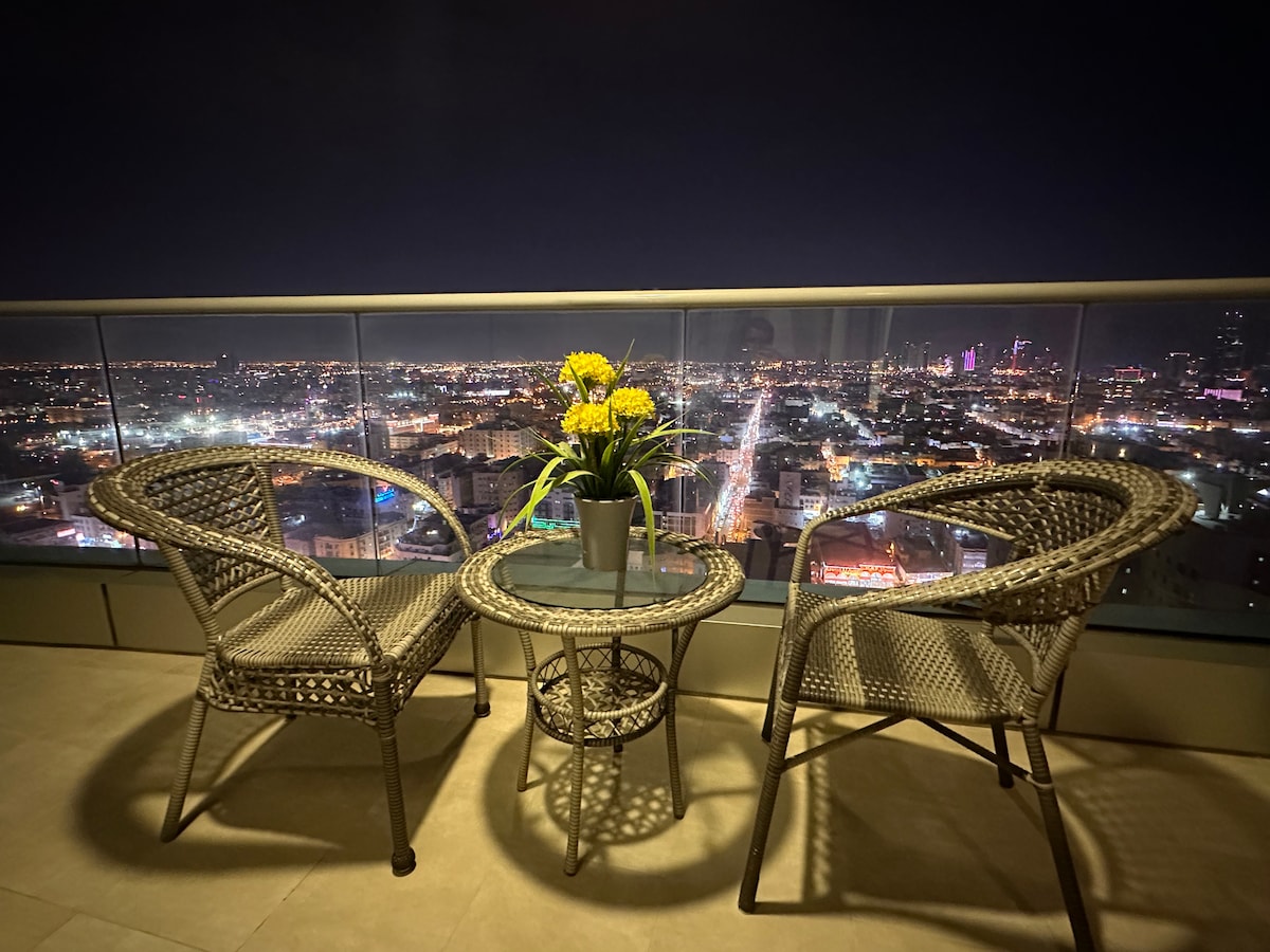 Len deg tilbake og slapp av i denne koselige, elegante leiligheten. Condo 327 er en helt ny, velutstyrt leilighet med utsikt mot havet og byen, med to private balkonger med utendørs huske, PS5, to smart-TV-er (med Netflix), komfortabelt fjærkledd, raskt trådløst nettverk, toalettartikler og fullt utstyrt kjøkken i 32. etasje i en nydelig nybygget og sikker bygning. Full tilgang til alle fasiliteter. – Treningssenter. – svømmebasseng – badstue – kino – squashbane – sikkerhet døgnet rundt