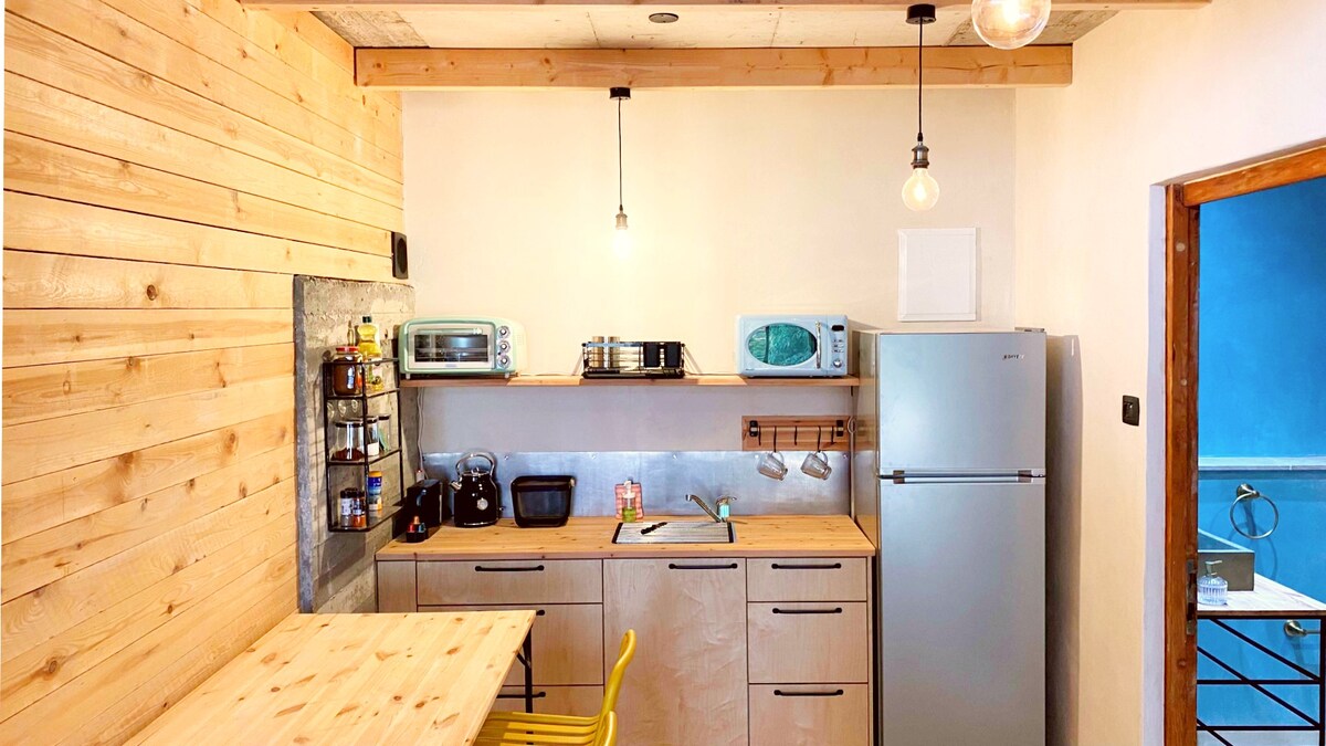 This private suite is a simple specious studio which is a new Extension of an old house with black stone wall. My great grand parents lived here as one of the first 8 original houses in Kinneret, from the 1908th . The space is part of the house with its own entrance- an outdoor terrace where the kitchen/entrance area is and an outdoor bathtub. The house is located 400 meters from the sea of Galilee (across road 90).