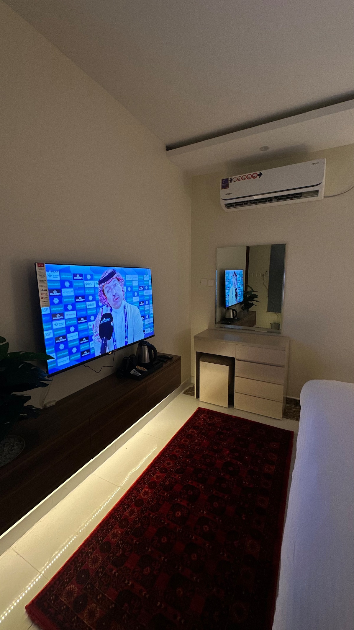 شقه بتصميم حديث غرفة نوم وصــالــة تحتوى على غرفه نوم بسرير ماستر بمفرش فندقي وصاله مساحه واسعه بتلفزيون ذكي 60 بوصه بدعم اشتراك نت فلكس ومجهز ثلاجه وايضاً يوجد بار قهوة وشاهي وغلايه وادوات الشاي ودورة مياة مجهزة بالكامل بالاضافة الي وجود انترنت مجاني عالي السرعه وتمتاز الشقه بالخصوصية العالية بدخول ذاتي كما يوجود مصعد كهربائي و مواقف خاصه تقع في حي الريان
