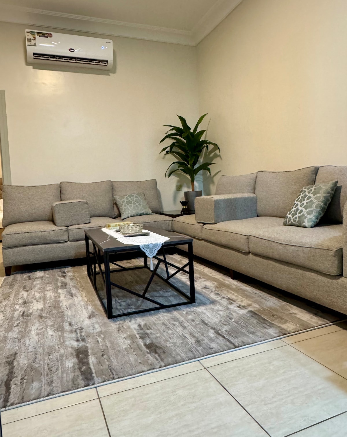 Romslig og elegant leilighet for ikke-røykere med smart inngang og en unik beliggenhet nær restauranter og kafeer (Starbucks, Loft, Al Baik..) Leiligheten har en stue, spisestue, to store soverom, kjøkken og en rolig uteplass for friluftsliv. Kjøkkenet er elegant designet for å dekke dine behov og er utstyrt med en ovn, kjøleskap, kjøkkenutstyr og en kaffekrok. Kaffehjørnet inkluderer en kaffemaskin og flere typer kaffe og te, inkludert arabisk kaffe. Stuen har en 60-tommers smart-TV som inneholder alle sports- og underholdningsplattformer, se VIP-sport, Netflix