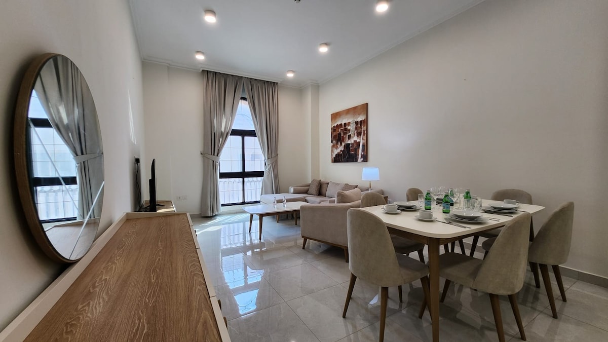 Velkommen til ditt lyse og stilige tilfluktssted i hjertet av Lusail. Denne nyinnredede leiligheten ligger på gate 117, bygning 14, og tilbyr et fredelig opphold med vakkert naturlig lys, moderne finish og rolig boligatmosfære. Perfekt for par, venner, familier og forretningsreisende. Gå inn og nyt et sted designet for komfort.