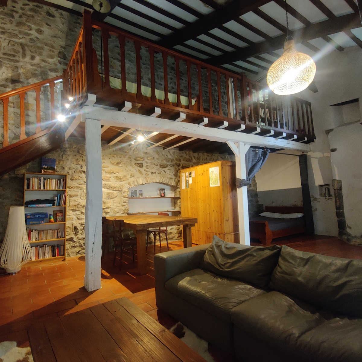 Vi tilbyr våre reisende et gammelt kafé-teater som kommer til live i en barokk og intim innredning, røde stoler, gamle lysekroner ... En buet vindu åpner seg mot 500 m² hage med trær og blomster. Interne regler: LOFTET er ikke egnet for mer enn 2 personer. Strengt forbudt: fester, bursdager og familiemåltider... Ikke røyk, ikke brenn stearinlys og røkelse. Ikke bruk pianoet og biljardbordet. Ikke egnet for barn under 12 år