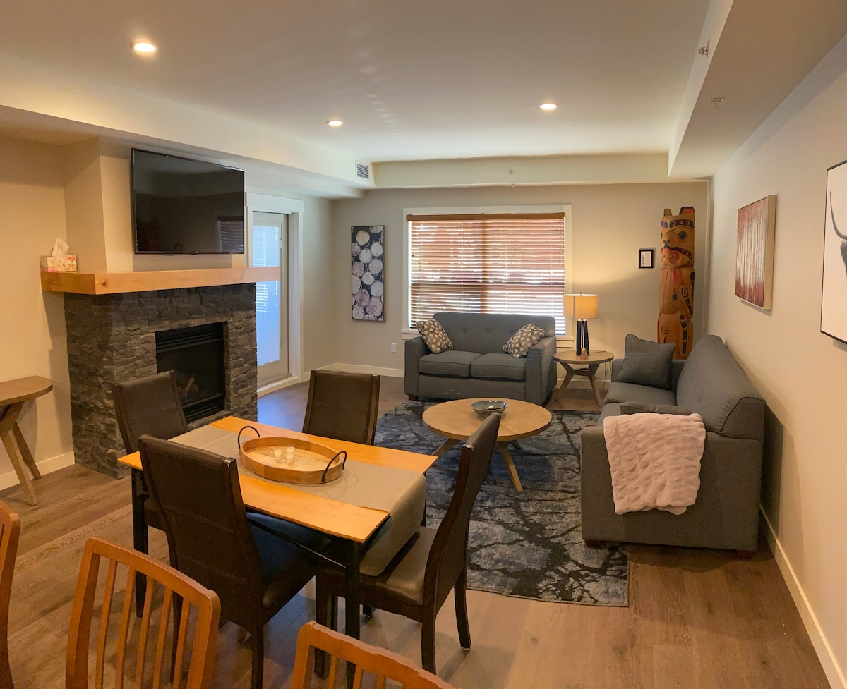 Velkommen til vårt luksuriøse feriested i hjertet av de kanadiske fjellene. Den eksklusive toppleiligheten vår har et majestetisk hvelvet tak, eksklusive møbler, fullt utstyrt gourmetkjøkken, balkong og undergrunnsparkering. Hovedsuiten har en king size-seng og eget bad. Arbeidsrommet er innredet som et ekstra soverom med en queensize-seng og et halvt bad på andre siden av gangen. Perfekt for ett eller to par, men har plass til opptil fem. Nær alt! Bedriftslisens RES-09964