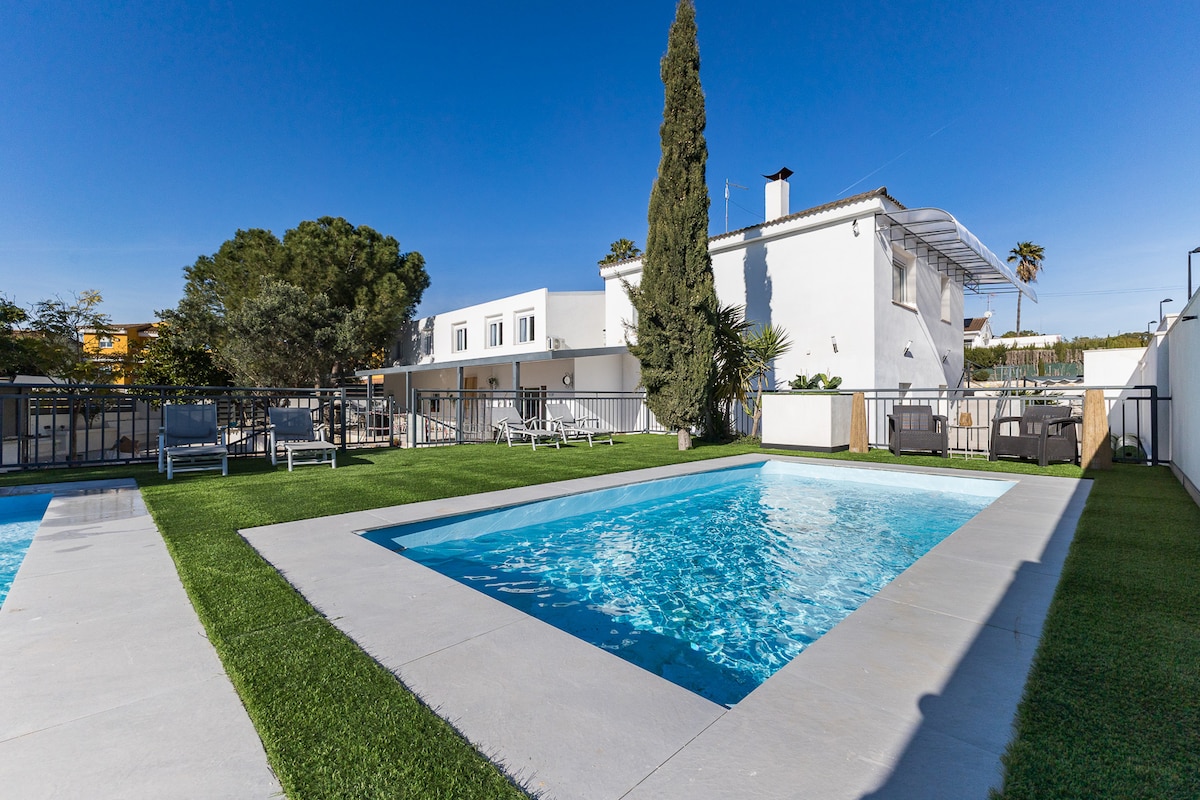 I denne boligen puster du ro: slapp av med hele familien! Bare 30 minutter fra Valencia, har vi en totalrenovert villa med alle fasiliteter for et behagelig opphold: -4 soverom / 4 dobbeltsenger -3 sovesofaer i spillrommet og treningsstudioet - stor lukket hage for barn og kjæledyr. - Svømmebasseng med utendørs bad - 2 fullt utstyrte kjøkken - utendørs overdekket område for aktiviteter - vaskerom med vaskemaskin, tørketrommel og rengjøringsprodukter