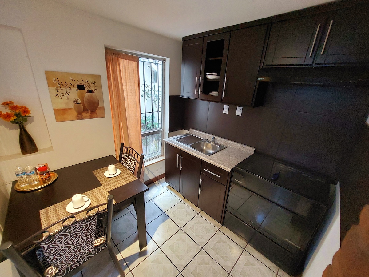 Privat leilighet i et godt og trygt bolig- og forretningsområde 5 minutter fra distrikt 1. Fire minutter fra Fashion Mall. 6 minutter fra det historiske sentrum. 8 minutter fra Chepe-stasjonen. Med alt du trenger for lange, komfortable og rolige opphold. Foran er det et Guadalajara-apotek som er åpent 24 timer i døgnet, og på hjørnet en Oxxo som er åpen 24 timer i døgnet. Komfortabel og rolig leilighet for lange opphold. Møter eller besøk er ikke tillatt.