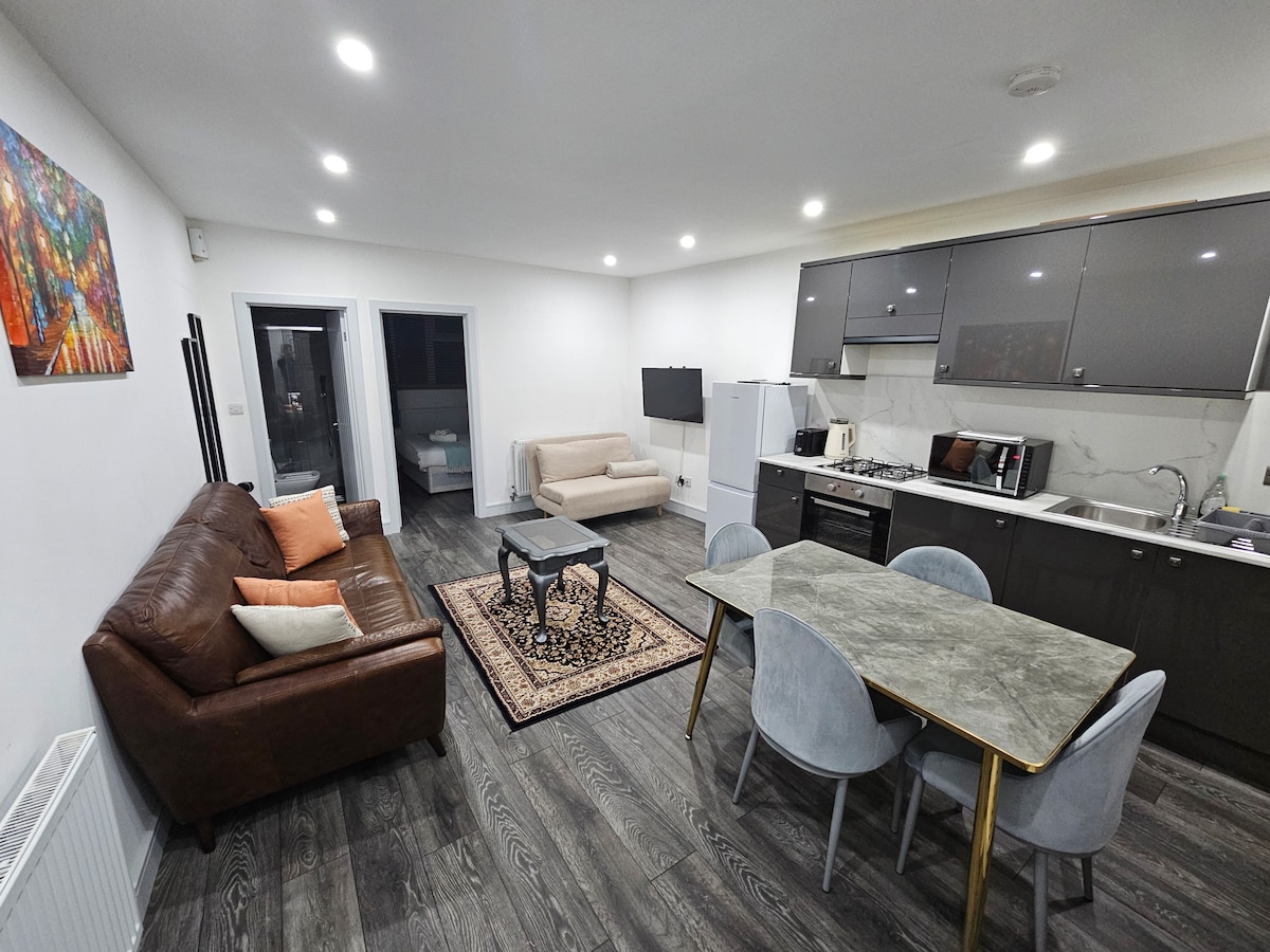 Welcome to our brand new flat, completed in 2024, in peaceful North London (N11), just 8 mins from Arnos Grove Tube (Piccadilly line) with direct access to Central London. Smart 50m² layout, ideal for families, friends or business travellers. ✔ Flexible sleeping - 4 separate sleeping arrangements (sleeps up to 5) ✔ Free street parking - rare in London ✔ Private entrance & patio ✔ Kitchenette for light cooking ✔ Carpet-free - great for allergy-sensitive guests ✔ Self check-in & Wi-Fi