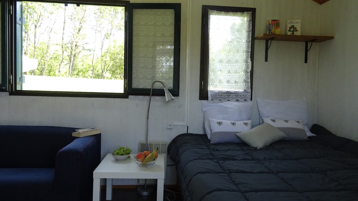 I skogkanten kan du nyte roen og autentisiteten i denne boligen i hjertet av uberørt natur. I denne 40 m2 store bobilen som ligger ved siden av oss, finner du: – En stue med spiseplass med utsikt over terrassen og den inngjerdede hagen, med en sovesofa. - Fullt utstyrt tekjøkken. – to bad med dusj og vaskemaskin - to toaletter, - To soverom hver med en 140 x 190 seng. – én privat og skjermet parkeringsplass