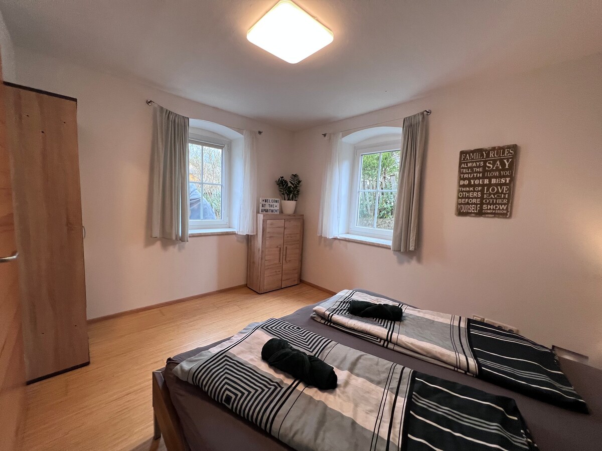 Vårt nyrenoverte, vakre hus i tradisjonell arkitektonisk stil ligger midt i den pittoreske klimatiske spa-byen Altaussee, 500 meter fra innsjøen og 5-10 minutter med bil fra skiområdet, påskeliljebad, golfbane og Bad Aussee med togstasjon og andre shoppingmuligheter. Leilighet 1 ligger i første etasje med tilgang til hage og terrasse, og er ideell for to voksne (soverom med to sammenstilte enkeltsenger) og to barn eller tenåringer (lite soverom med køyeseng).