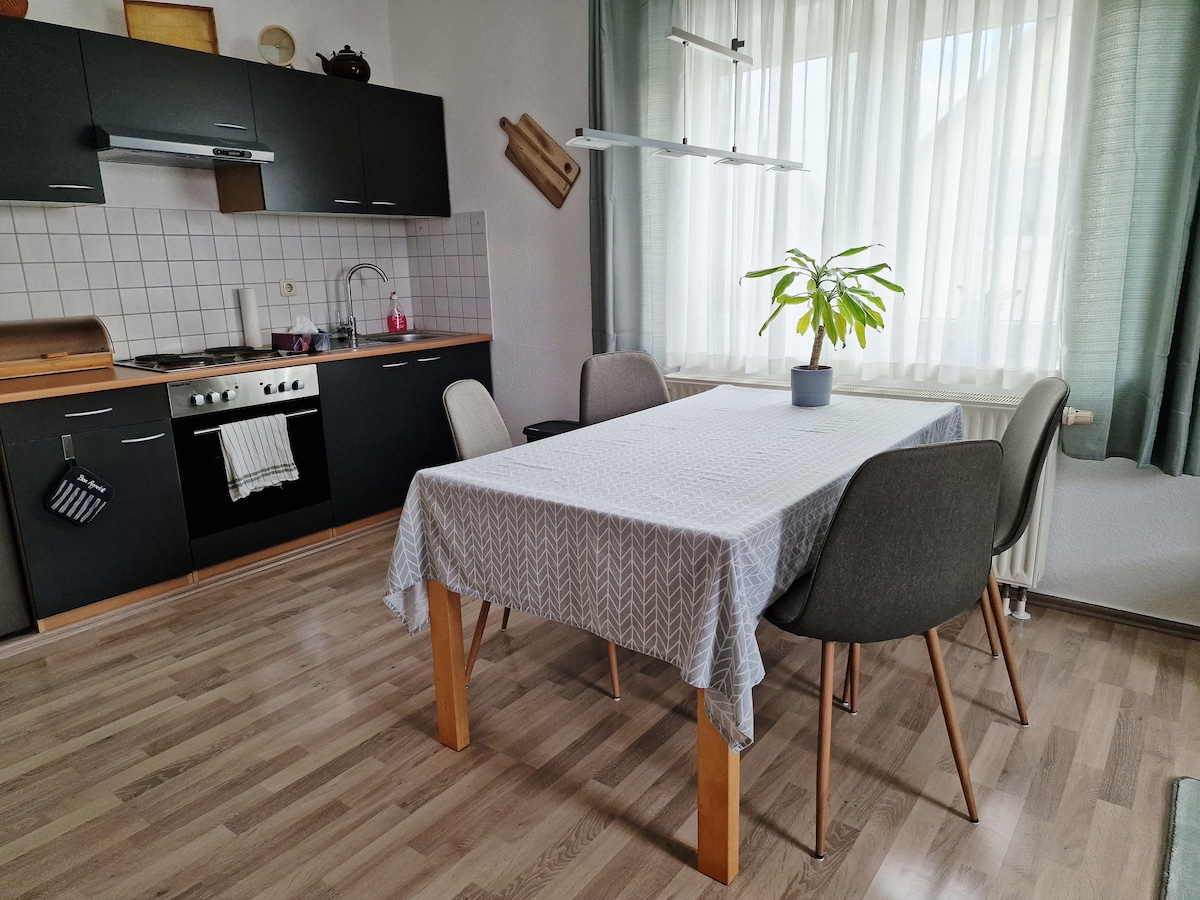 Wohnung im Erdgeschoss mit Schlafzimmer und zwei Betten, Wohnzimmer, Bad und Küche falls erforderlich. Die Wohnung ist nicht abgeschlossen, Zugang über das Treppenhaus. Ruhige Lage . Parkplatz vorm Haus. Zur Zeit haben wir aus medizinischen Gründen etwas gegen Haustiere (Lebendnierespende)