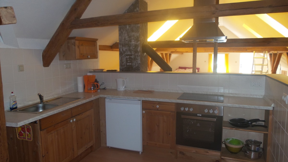Sjarmerende, familievennlig ferieleilighet på en fullt utbygd gård (jordbruk)! Stue med peis, soverom med dobbeltseng, romslig dusjbad med vaskemaskin, pent, fullt utstyrt kjøkken med spiseplass. Sofaen i stuen kan trekkes ut til en ekstra dobbeltseng. Babyseng, babybay og babybadekar tilgjengelig. Liten terrasse foran inngangsdøren, bakgård, hagemøbler tilgjengelig. Hunder er velkomne etter avtale!