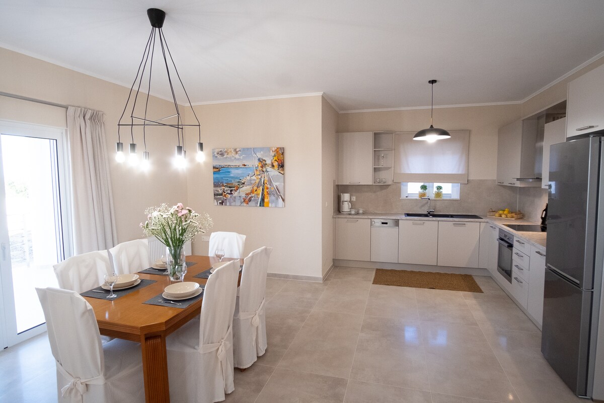Villa Arion er en del av Diodati Villas, et rolig tilfluktssted i åssiden med panoramautsikt over havet og autentisk, varm gjestfrihet. Den er ideell for par eller familier, og har to soverom, tre bad, et fullt utstyrt kjøkken og et fantastisk utendørsbassengområde. Det gratis trådløse nettverket Starlink passer perfekt for fjernarbeid og tilkobling. Nyt det private bassenget, solsengene, stuen, utedusjen, grillen og det skyggefulle spiseområdet. Uforglemmelige avslappende øyeblikk, badet i den greske solen, med utsikt over Det joniske hav.