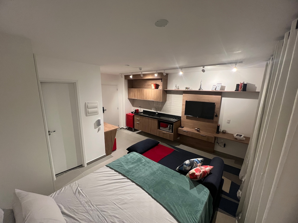 Studio optimalisert for å forene arbeid og hvile. Stor arbeidsbenk, med wifi og kabelinternett. TV som kan konverteres til en ekstra skjerm (HDMI-kabel). Klimaanlegg og dobbeltseng. Balkong med glass. Flere alternativer for måltider og hvile. Komplett kjøkken: elektrisk ovn, mikrobølgeovn, kokeplate, redskaper. Kraftig dusj med sentralvarme. Strykejern, hårføner. Vaskeri i bygningen. Basseng på taket med vakker utsikt over São Paulos skyline.