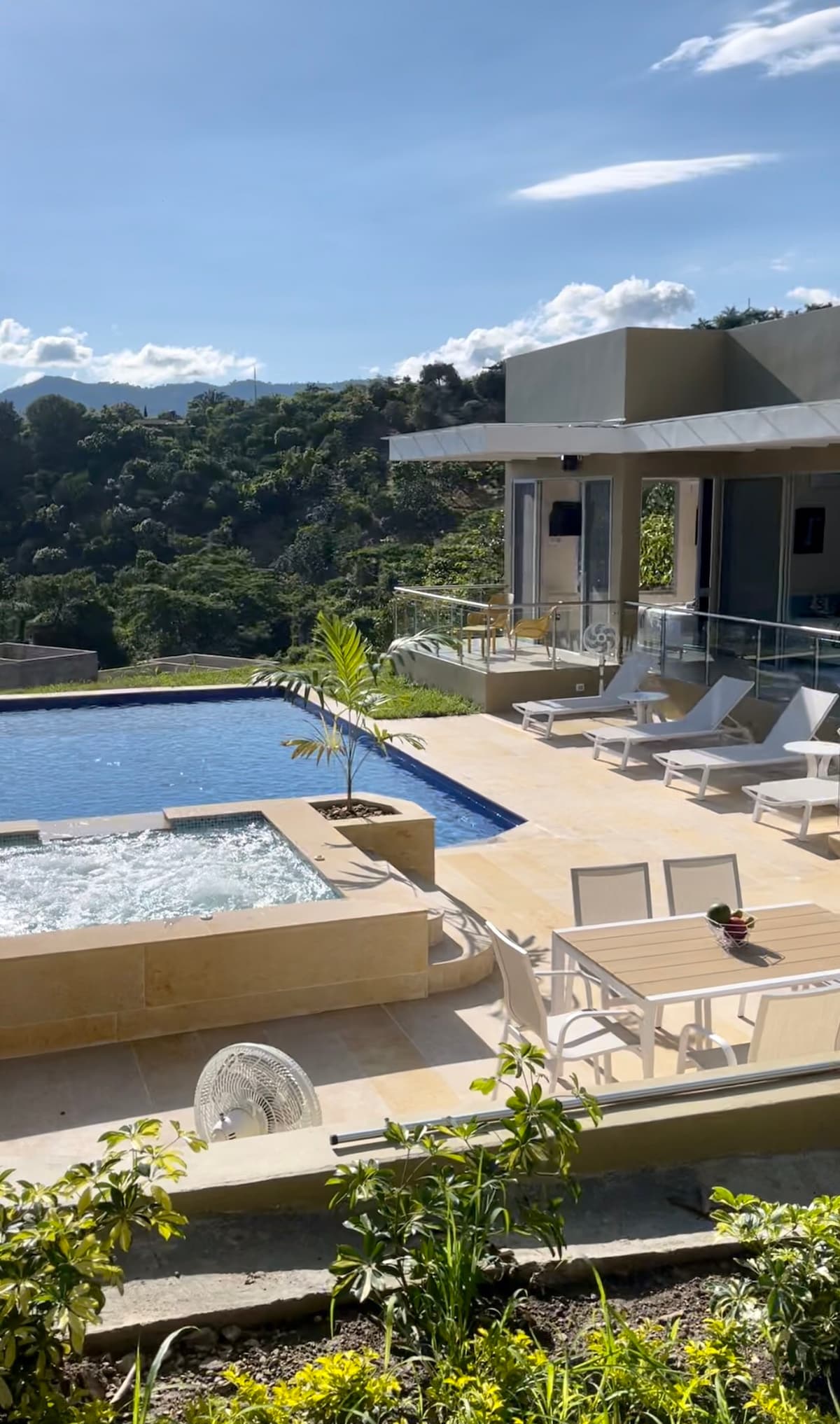 Casa vacacional cerca de Anapoima, con una de las mejores vistas de Colombia. Ideal para descansar o hacer teletrabajo rodeado de naturaleza. Ubicada en un conjunto cerrado y seguro, cuenta con: 🏊♀️ Piscina privada con vista panorámica 🛁 Jacuzzi con agua caliente 📶 Wifi de alta velocidad (ideal para teletrabajo) 📺 Televisión nacional y Netflix 🌬️ Ventiladores 🔥 BBQ a gas y zona exterior 🌞 Sillas para tomar el sol 🌳 Entorno tranquilo y privado 🐾 Pet friendly