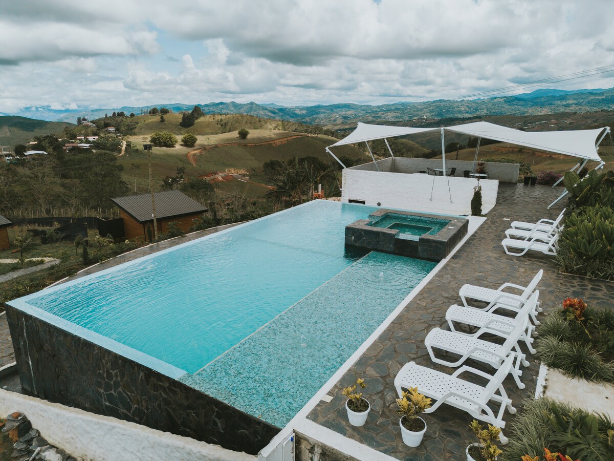 Et sted å le, hvile og leve sakte. To koselige hytter: den største med tre soverom, to bad, stue, spisestue og peis, den andre med to soverom, bad, kjøkken, stue og balkong med utsikt over fjellet. To ekstra bad. Nyt et opplyst basseng, jacuzzi, grillområde, leirbål, fotoområder, biljard, froskespill, guadual med hengekøyer, trehus, stier, leker og bane for barn. Moro om dagen, rolig om natten. Pris fra mandag til torsdag 900 000 USD maks 12 personer.