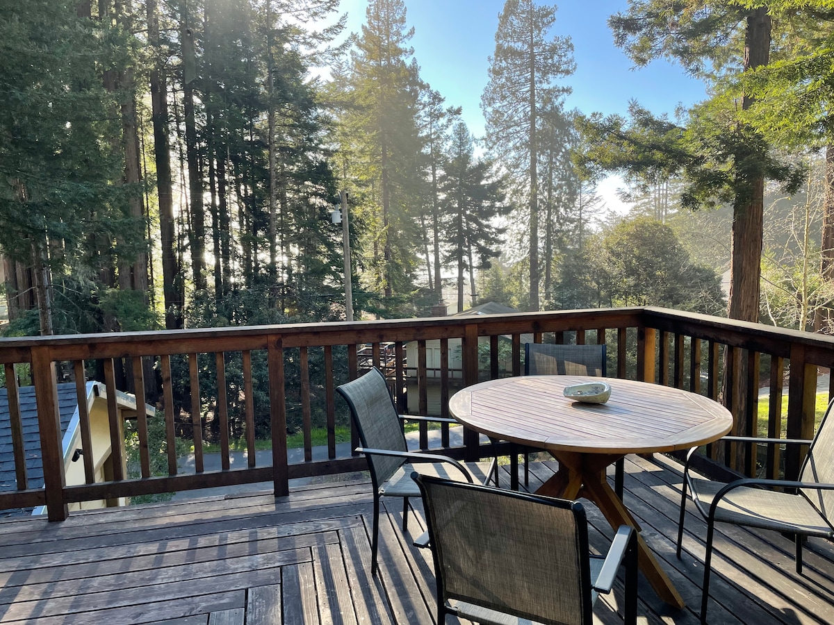 **Nylig oppdatert/møblert på nytt!** Dette huset ble kalt «The Ranch House» av arkitekten Don Jacobs. Denne oppdaterte 70-tallshytta er en skogferie med moderne følsomhet. Huset er omgitt av redwoods og har to store terrasser, én med propanbålplass og rikelig med sitteplasser, den andre med boblebad. Stuen har bildevinduer med skogsutsikt og Morso-vedovn. Gjester oppfordres til å nyte turstiene, bassengene og utendørsfasilitetene. Huset har komfortabelt plass til 4 personer, pluss fiberoptisk internett.