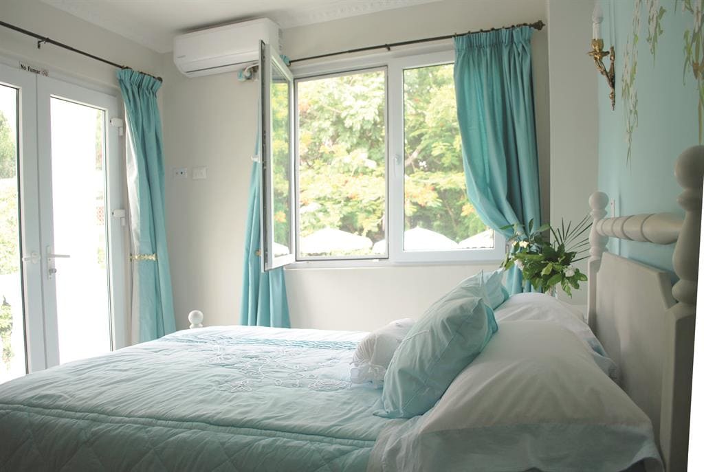 Du blir sjarmert av dette spesielle rommet til to. Dette rommet i første etasje med to vinduer med utsikt over havet og hagen tilbyr en pute topp dobbeltseng/full (137 cm x 190 cm), to nattbordslamper, gratis trådløst nettverk, flatskjerm smart-TV og et privat bad med en dusj. Nyt den delte balkongen med utsikt over havet, den tropiske hagen eller skogen og til et delt hengekøyeområde. I tillegg kan du nyte: Plunge Pool -Sun Terrace - Gardens - I nærheten av gammel skog. Kjæledyr kun i suiter, ikke dette rommet. Rommet har klimaanlegg.