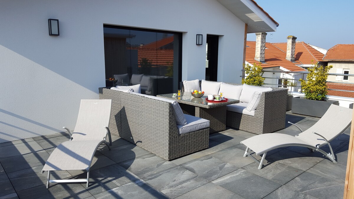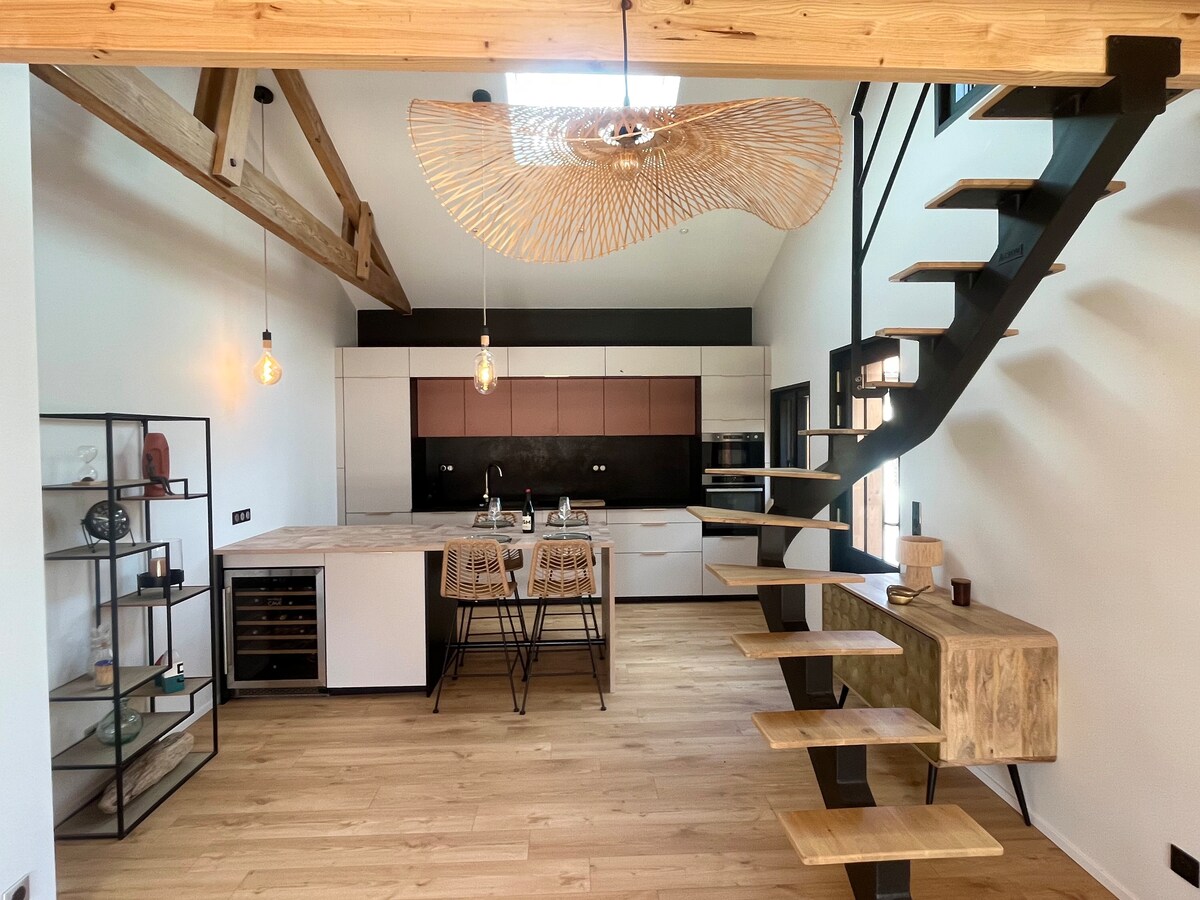 Nyt et nytt og elegant hjem, med et stort soverom og en queensize-seng, sovesofa i stuen. Komfortabel, privat parkeringsplass, klimaanlegg og trådløst nettverk. Veldig godt plassert i hjertet av byen Andernos, men i en rolig bolig. 350 meter fra østershavnen og stranden, og mindre enn fire minutters gange til bryggen og gågaten. Mulighet for å gå til butikker og supermarked. Innsjekking uten vert er mulig.