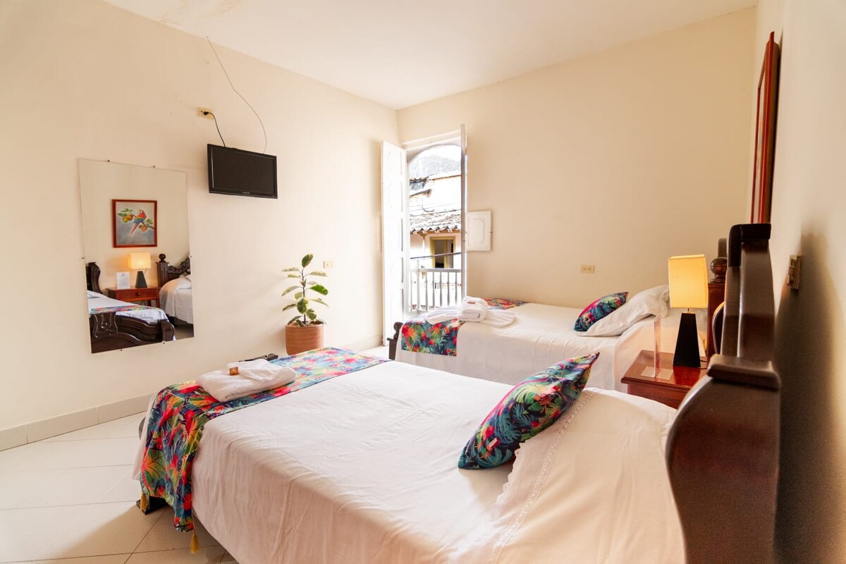Ideal para parejas o viajeros solos. Para personas de 5 años en adelante. Cama queen y baño privado Vista al patio lateral del hotel. Ubicada en el segundo piso, acceso por escaleras.