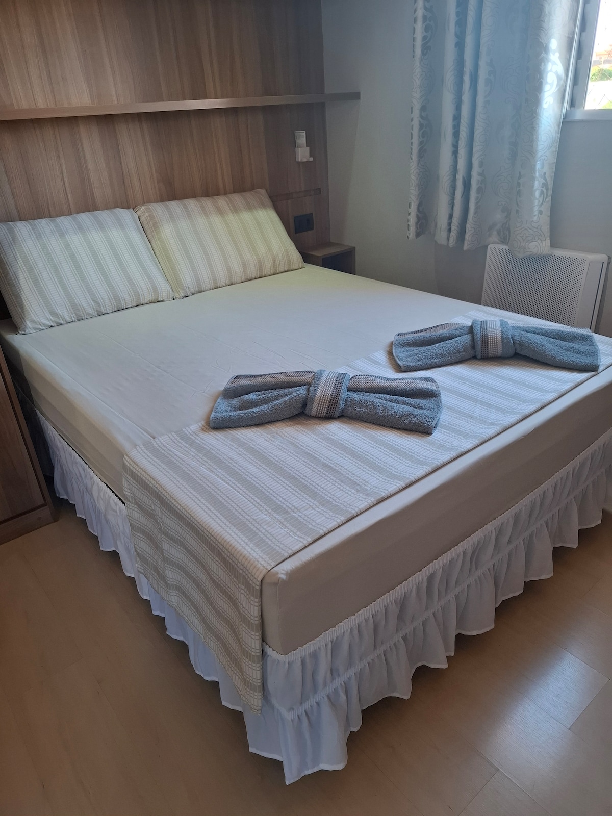 Vi bodde i Bandeirantes sentrum ✨Høydepunkter på stedet: Stue med komfortabel sovesofa og koselig belysning. Spisebord for fire personer Teksturert vegg med speil og moderne belysning Soverom med dobbeltseng, rent sengetøy og rolige omgivelser. Trådløst nettverk og TV tilgjengelig. Klimaanlegg og godt opplyst miljø. 🌿 Innredningen kombinerer moderne og naturlig stil, og skaper et trivelig sted for både avslapning og arbeid. Merk: Vi har ikke komfyr.