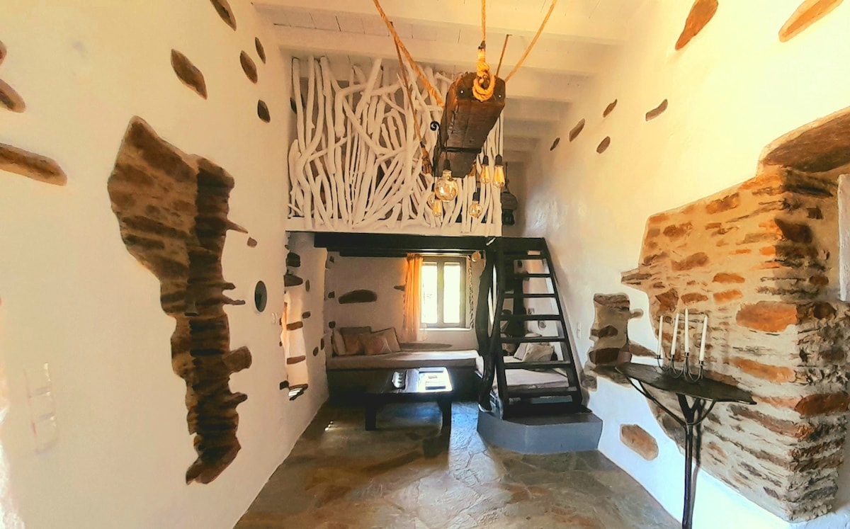 Et lyst hjem fra 1800-tallet med en lang familiehistorie, med balkong og terrasse med et barområde med 180 graders utsikt over sjøen, i de mest pittoreske omgivelsene på Kykladene, i nærheten av et venetiansk slott, ett minutts gange til badested.
