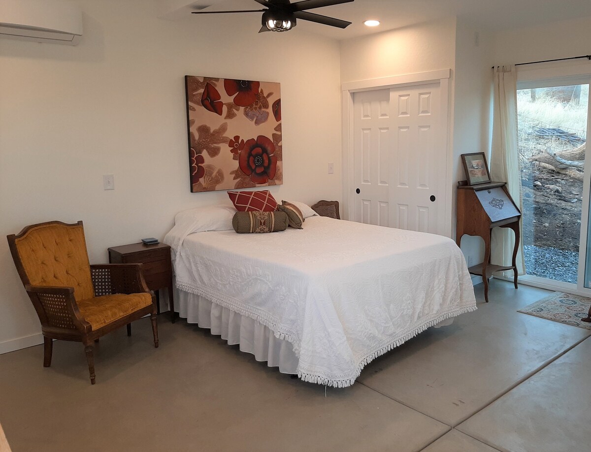 Hideaway er et fortryllende ettroms casita som ligger på den ytre toppen av eiendommen, The Confluence. Våkne til soloppgangen med en frodig *utsikt*over det naturlige landskapet fra din private terrasse. Hideaway nås med en gangsti (200 fot) fra hovedhuset. Det private badet ligger utenfor hovedhuset (200 meter fra rommet). Fra parkeringsområdet til rommet er det omtrent 120 meter. Det er ikke kjøkken eller andre matlagingsapparater enn en vannkoker og et minikjøleskap.