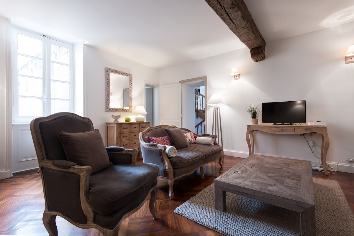 Stille i hjertet av La Rochelle Velkommen til La Rochelle, du er i et hus oppført i oversikten over historiske monumenter. Det finnes ca. 14.300 kommuner i Frankrike. Ideelt plassert i hjertet av det historiske sentrum av La Rochelle, er denne sjarmerende leiligheten en duplex på 100 m2 med foreldresuite. Den drar nytte av en dobbel eksponering som gjør den veldig lys og ikke gir på gaten roen som hersker der, noe som innebærer ingen støyplager, ingen fester, respekt for nabolaget.