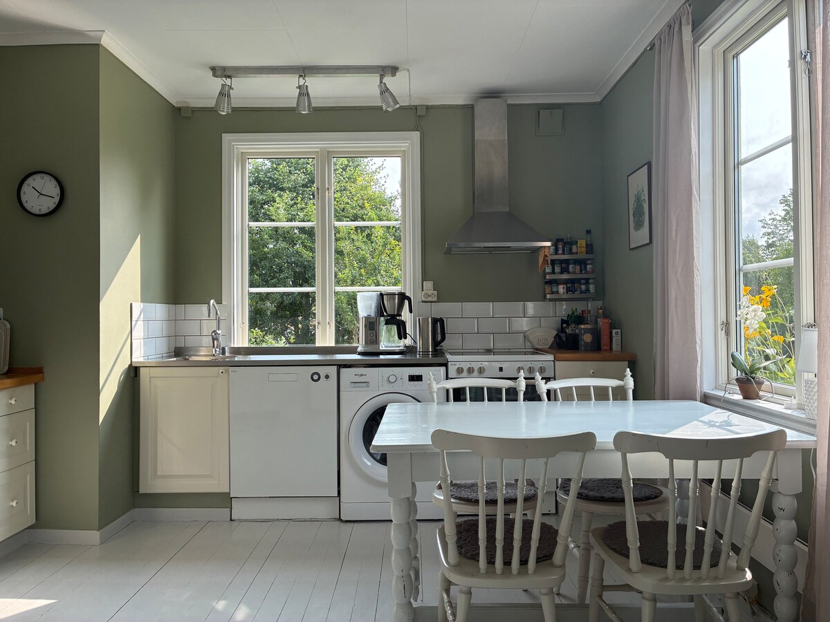 Här bor du i rymlig (75 m2) lägenhet i ombyggd lada med alla bekvämligheter, kamin och uteplats med sjöutsikt. Bara 300 meter till Kabbosjön med strand och bryggor. Här kan du se vilda djur ströva förbi så som rådjur och räv. Du kan njuta av fina skogspromenader, paddling, bär- och svampplockning. Boendet har ett stort sovrum med dubbelsäng samt en bäddsoffa. Vardagsrum med utgång till uteplats samt ett sovloft med två enkelsängar. Det finns även en enkelsäng i vardagsrummet.